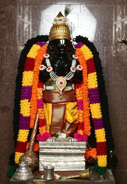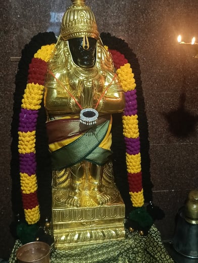 Exhibiting Sri Anjali Hanuman, a honored figure in the Sri Sitarama Anjaneya Madam, representing dedication and power. This sacred image of Anjali Hanuman, while previously referred to as a 17-foot tower, is shown here at a modest height of 3 feet.